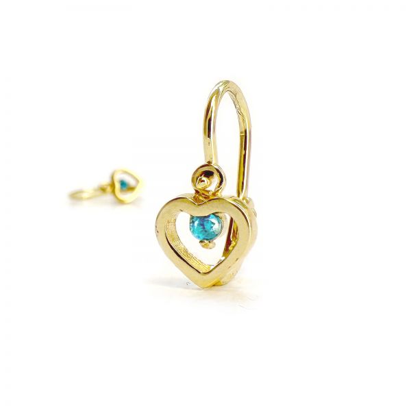 Arany baba fülbevaló kék kővel - áttört szív forma, 14K előlkapcsos zár