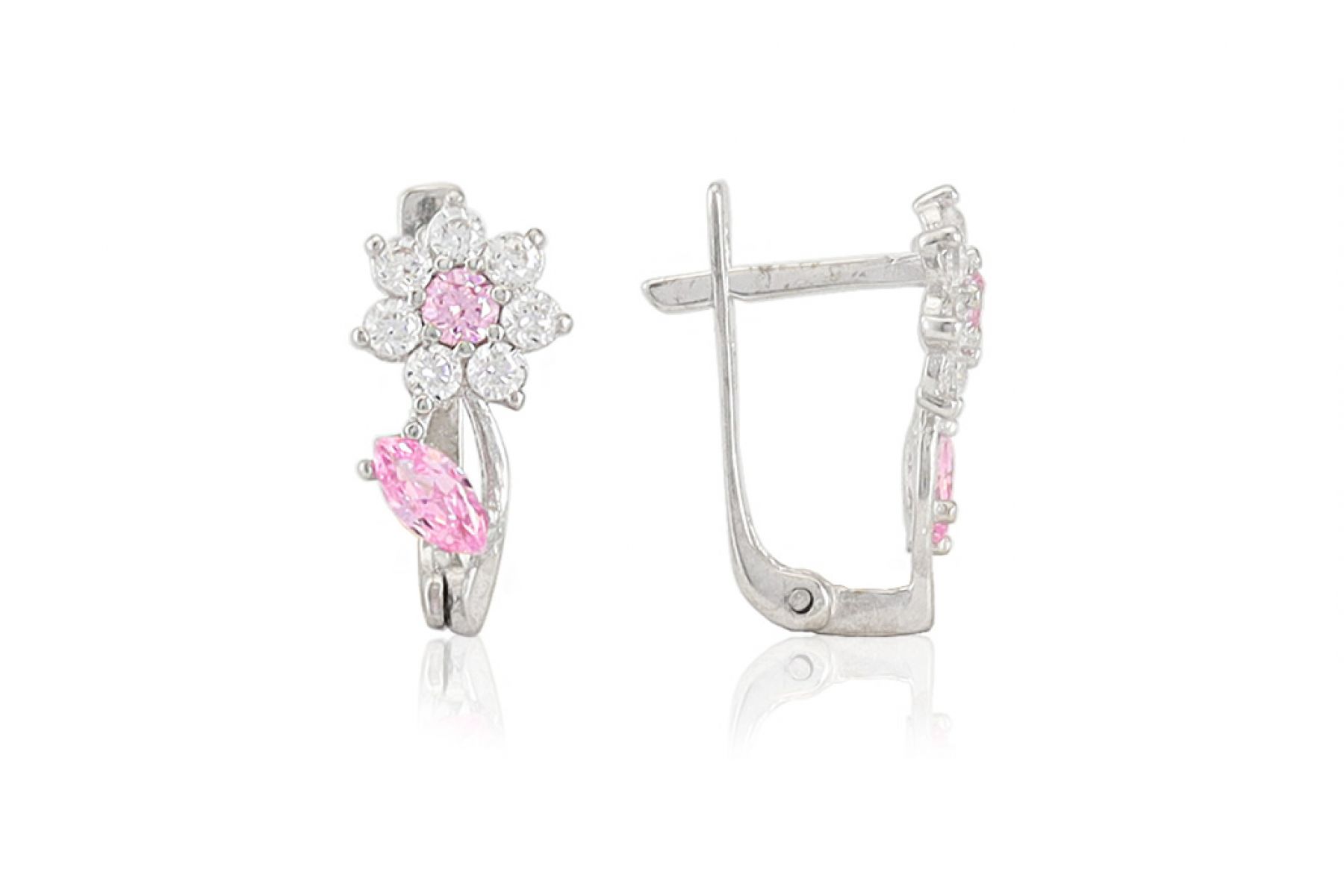 Az apró fehér és rózsaszín cirkónia kövecskék virágalakban vannak elrendezve, így különösen csinosan áll a legapróbb hölgyeken.