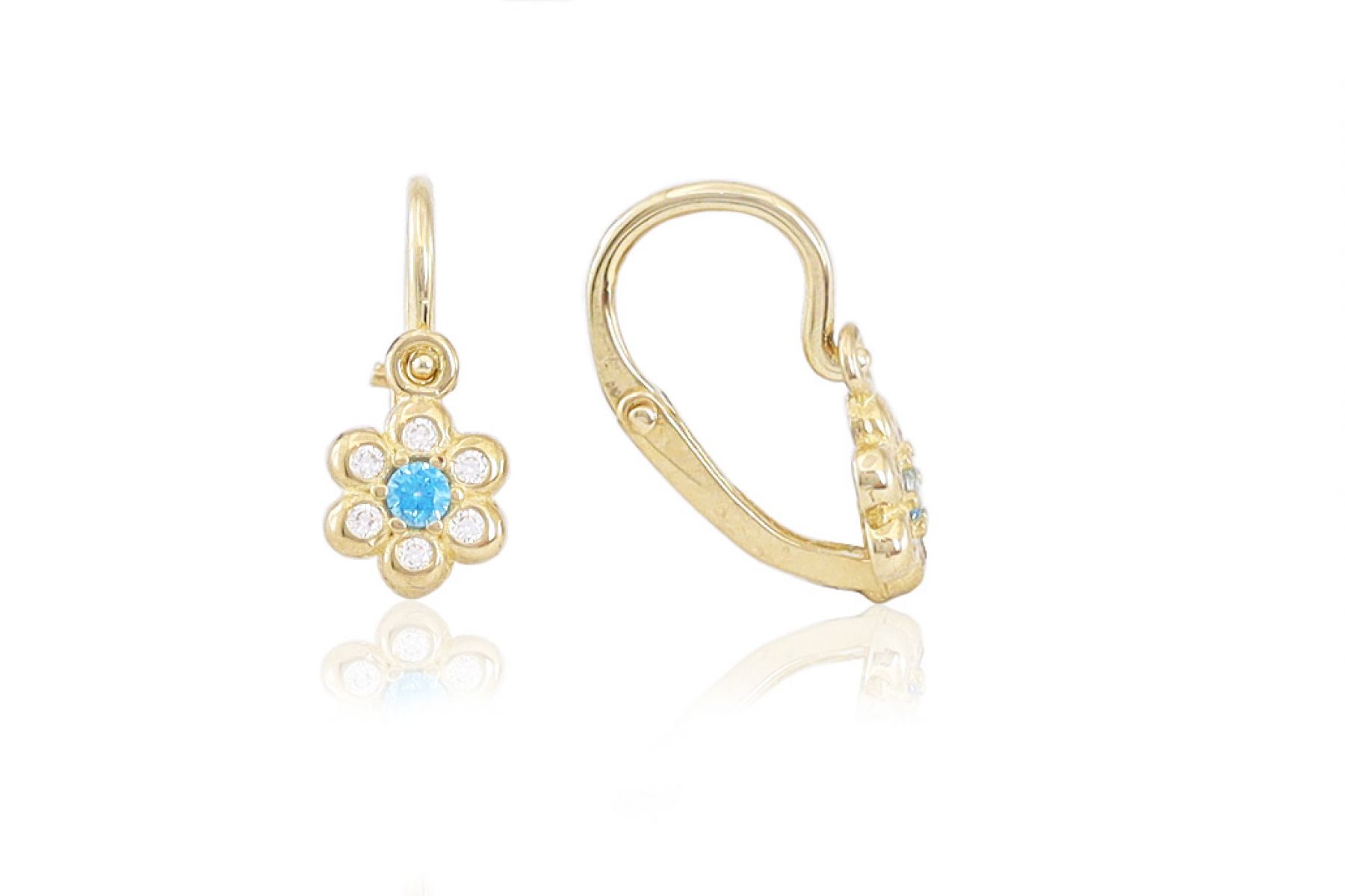 Arany baba fülbevaló elölkapcsos pici virág világoskék és fehér kővel
