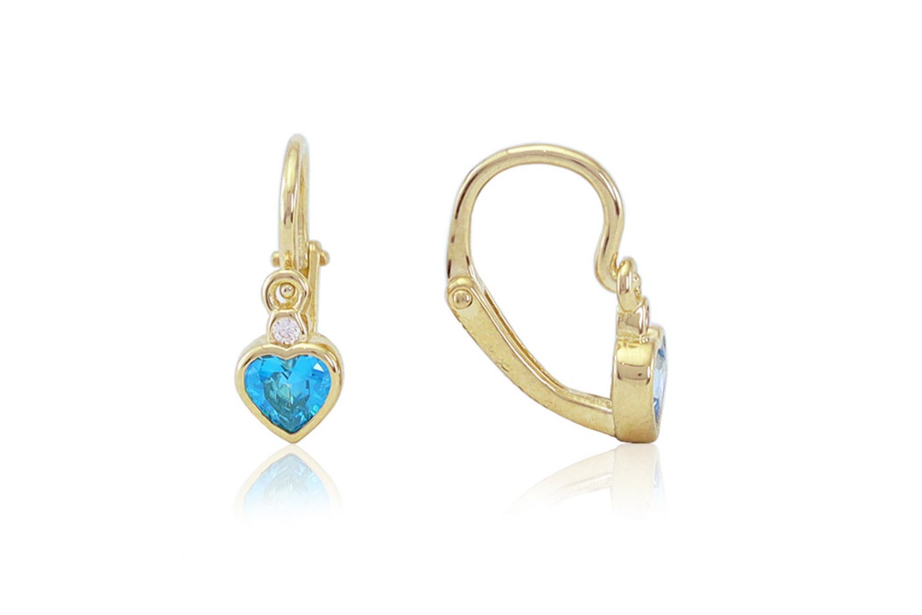 Arany baba fülbevaló elölkapcsos szív és button világoskék és fehér kövekkel