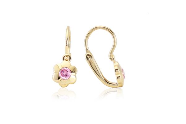 Arany baba fülbevaló elölkapcsos virág rózsaszín kővel