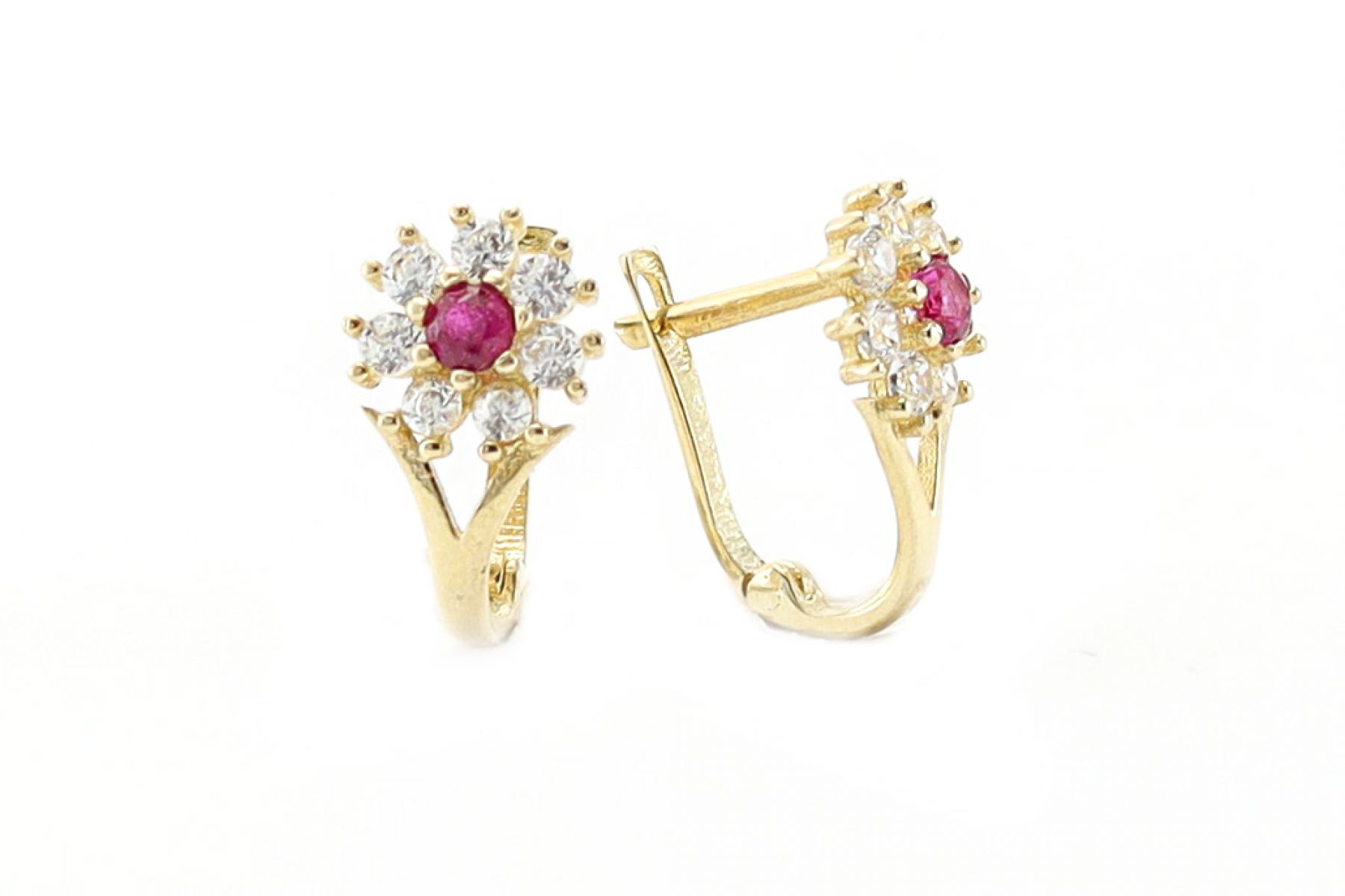 Arany baba fülbevaló franciazáras virág íves szárral pink-fehér kövekkel