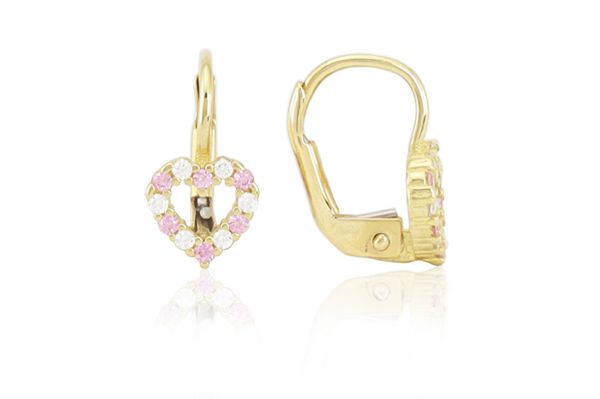 Amennyire aprócska, annyira szép és elegáns ez a szikrázó rózsaszín és fehér cirkónia kővel díszített arany szívecske mintás fülbevaló.