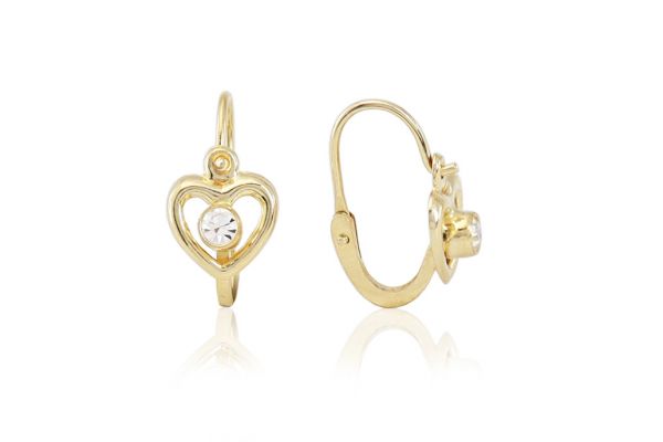 Ez az egyik legaranyosabb arany gyermek fülbevalónk! Az apró fehér kövecskék vidáman szikráznak a szívecskék közepén, bájos hatást kölcsönözve viselőjének.