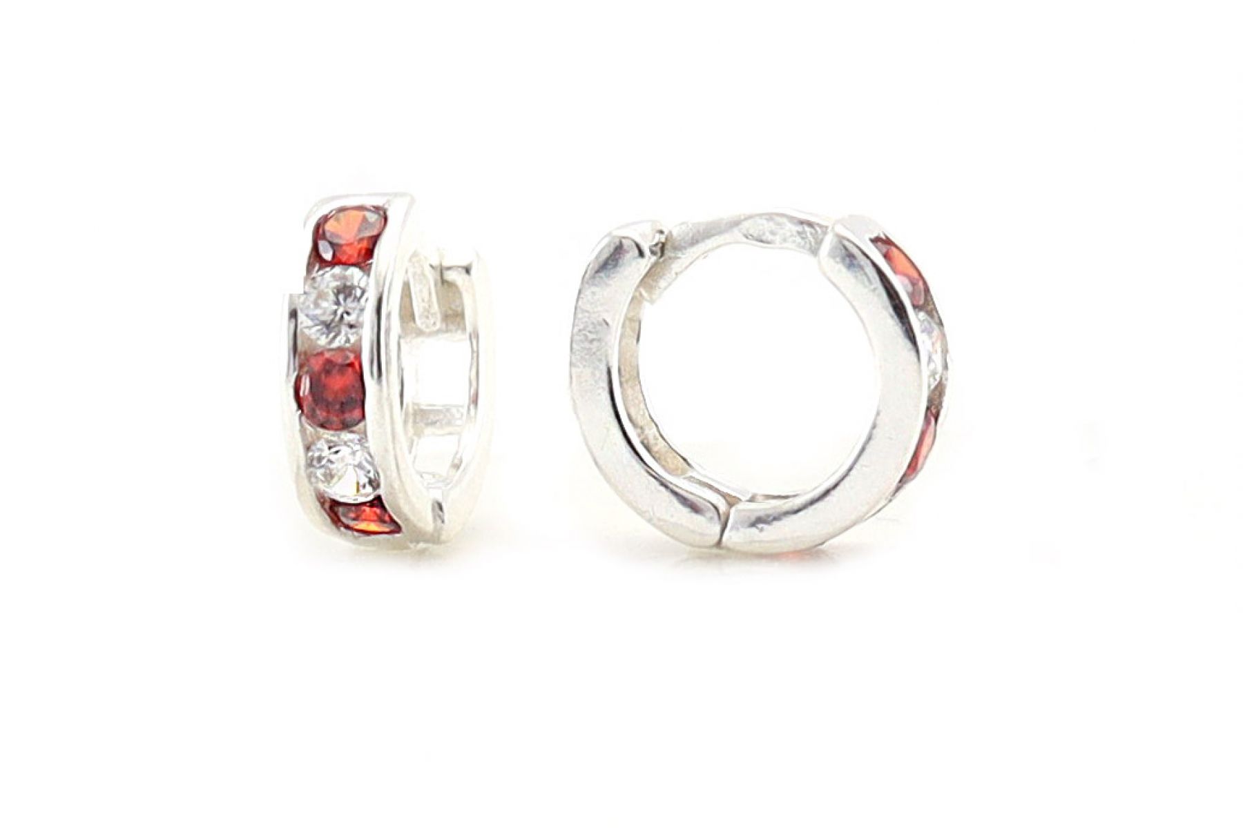 Ezüst baba fülbevaló karika vörös-fehér kövekkel