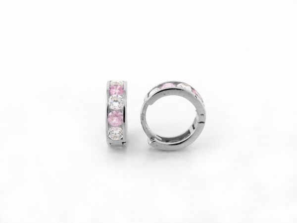 Rózsaszín és fehér köves bepattintós karika ezüst baba fülbevaló