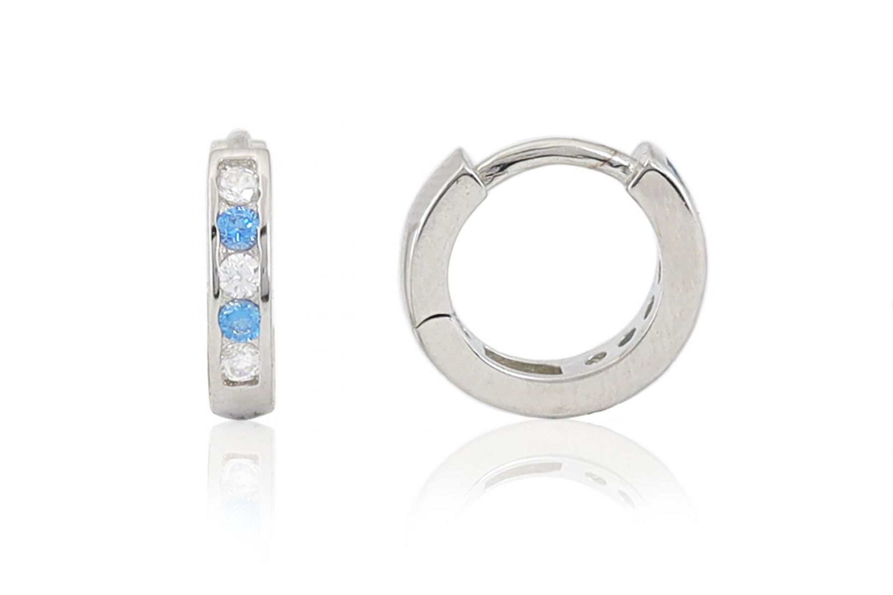 Ezüst gyermek fülbevaló keskeny karika ródiumbevonatos világoskék és fehér kövekkel 8mm