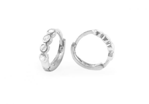 Különösen szépen ragyog és szikrázik a ráeső fényben ez a pár babafülbevaló. 4-4 fehér apró cirkónia kövecske van elrendezve a kör alakú ezüst fülbevalón, melynek biztonságos zárszerkezetét még a leghuncutabb ujjacskák sem tudják kinyitni.