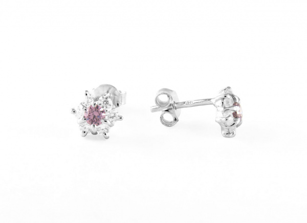 Nagyon aranyos és elegáns ez az apró virágos ezüst gyermek fülbevaló, melyet orgonaszínű és fehér cirkónia kövecskék díszítenek.